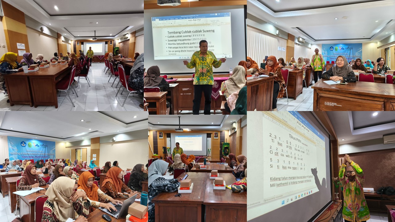 Prodi Pendidikan Bahasa Jawa melalui TIM PkM yang diketuai Prof. Dr. Afendy Widayat, M.Phil. dengan anggota Dr. Purwadi, M.Hum dan Galang Prastowo, M.A. melaksanakan *Pelatihan Nembang Dolanan dan Membaca Notasi bagi Guru TK dan PAUD di lingkungan Disdikpora Kabupaten Bantul*. Kegiatan pelatihan nembang ini diselenggarakan atas kerjasama Tim PkM dengan Disdikpora Kabupaten Bantul. Kegiatan ini merupakan upaya meningkatkan kompetensi pendidik dalam bidang seni dan budaya. Pelatihan ini dilaksanakan dalam dua kali pertemuan, yaitu pada tanggal 20 Agustus 2025 dan 28 Agustus 2025, bertempat di kantor Disdikpora Kabupaten Bantul. Kegiatan ini diikuti oleh 30 guru TK dan PAUD dari berbagai wilayah di Bantul dengan antusiasme tinggi, mengingat pentingnya penguasaan metode pembelajaran yang kreatif dan berakar pada budaya lokal.