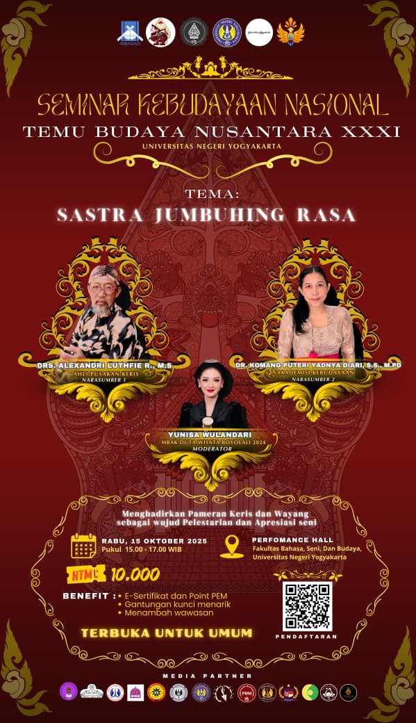 Yogyakarta, 15 Oktober 2025. Sebagai bagian dari rangkaian Temu Budaya Nusantara XXXI, Departemen Pendidikan Bahasa Daerah sebagai tuan rumah mengadakan seminar Seminar Kebudayaan Nasional dengan tema Sastra Jumbuhing Rasa: Menghadirkan Keris dan Wayang sebagai Wujud Pelestarian dan Apresiasi Seni pada Rabu, 15 Oktober 2025. Seminar yang diselenggarakan di Gedung Performance Hall Fakultas Bahasa, Seni, dan Budaya, Universitas Negeri Yogyakarta menghadirkan dua narasumber, yakni Drs. Alexandri Luthfie R., M.S. dan Dr. Komang Puteri Yadnya Diari, S.S., M.Pd. yang membahas nilai spiritual dan filosofi yang terkandung daam warisan budaya adiluhung keris.